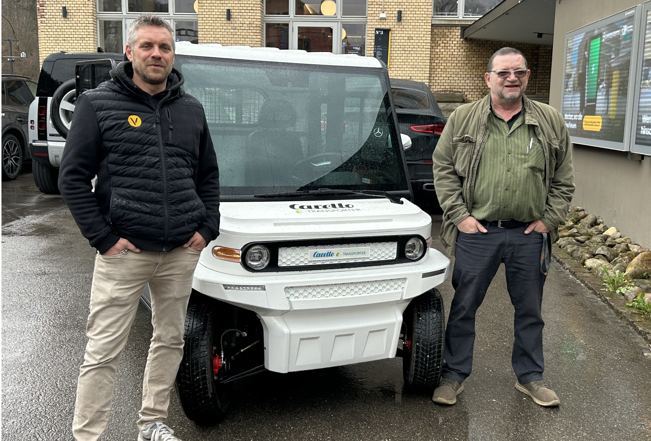 Sehen und gesehen werden, das ist dem Carello TR10 sicher im The Valley in Kemptthal. Bei der Ablieferung links Fabian Bhend, Leiter Facility Management und Georg Restle von Vögeli & Berger AG Hettlingen, unser Partner für Carello Elektrofahrzeuge in der Region.